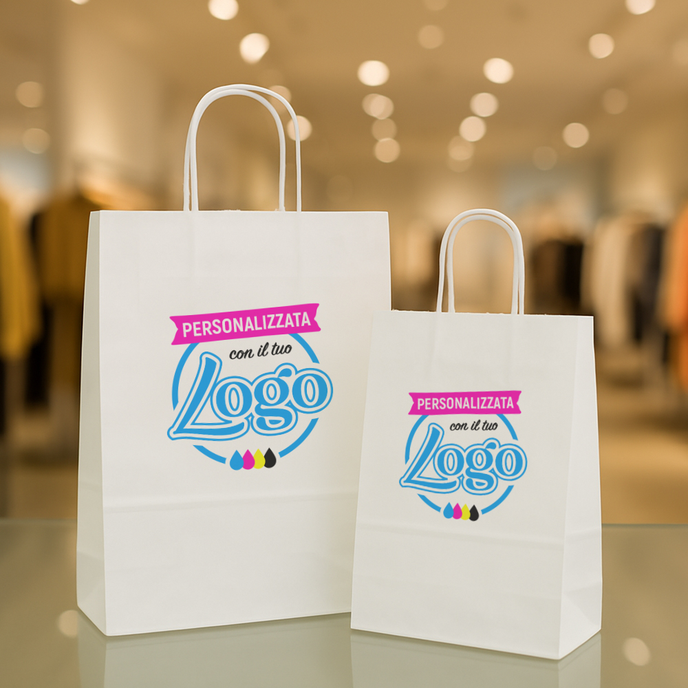 Personalizza le tue Eleganti Shopper in Carta con qualsiasi tipo di immagine anche in piccole quantità a partire da 100 pz. Le nostre Shopping Bag con Maniglia Ritorta sono una soluzione economica per confezionare i tuoi prodotti. Veicola il Marchio del tuo Negozio con le nostre Shopper ecologiche, offrendo il tuo contributo per limitare l’utilizzo della plastica.